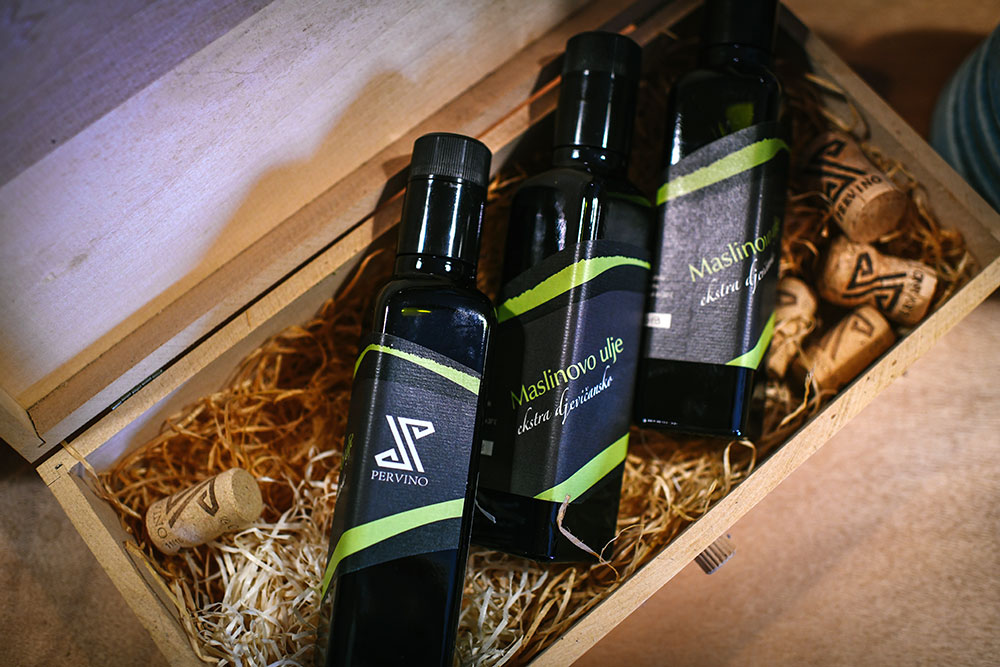 Na istarskom tlu oduvijek su se vinogradi ispreplitali s maslinicima, a ta je tradicija nastavljena i danas. PERVINO u svojoj ponudi ima i maslinovo ulje vrhunske kakvoće – ekstra djevičansko maslinovo ulje PERVINO. Ekstra djevičansko maslinovo ulje PERVINO kupaža je lokalnih sorti, od autohtone istarske bjelice, buže do internacionalnih leccina i pendolina. Spoj ovih sorti stvara ulja profinjenog, a opet izraženog okusa i mirisa uz savršen dodatak pikantnosti i gorčine. Od ove godine ponuda je obogaćena i monosortnim maslinovim uljem Buža kojeg karakterizira izraženi voćni okus uz balansiranu pikantnost i gorčinu.